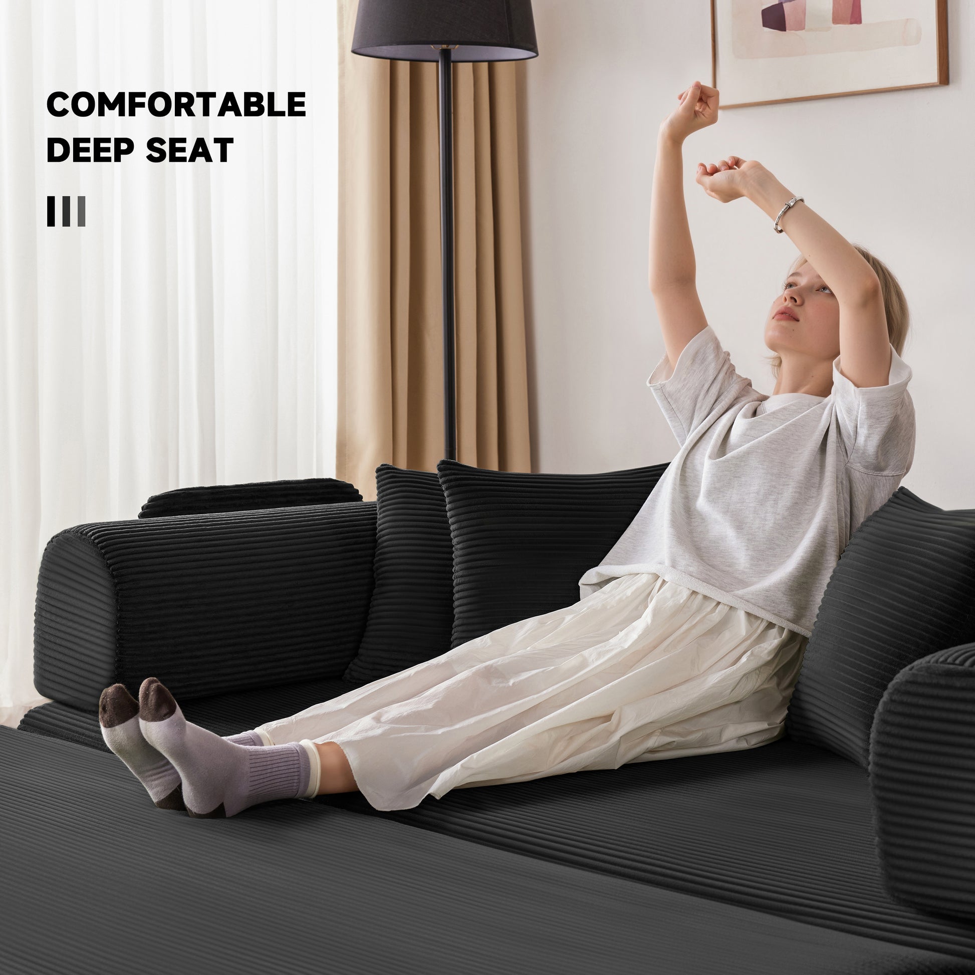 - User-Friendly Design:Our king size sleeper couch enjoy peace of mind with scratch-resistant, pet-friendly corduroy fabric, 4 included pillows, handy storage pockets, and fully washable backrest and seat cushion covers—making comfort and clean-up equally easy