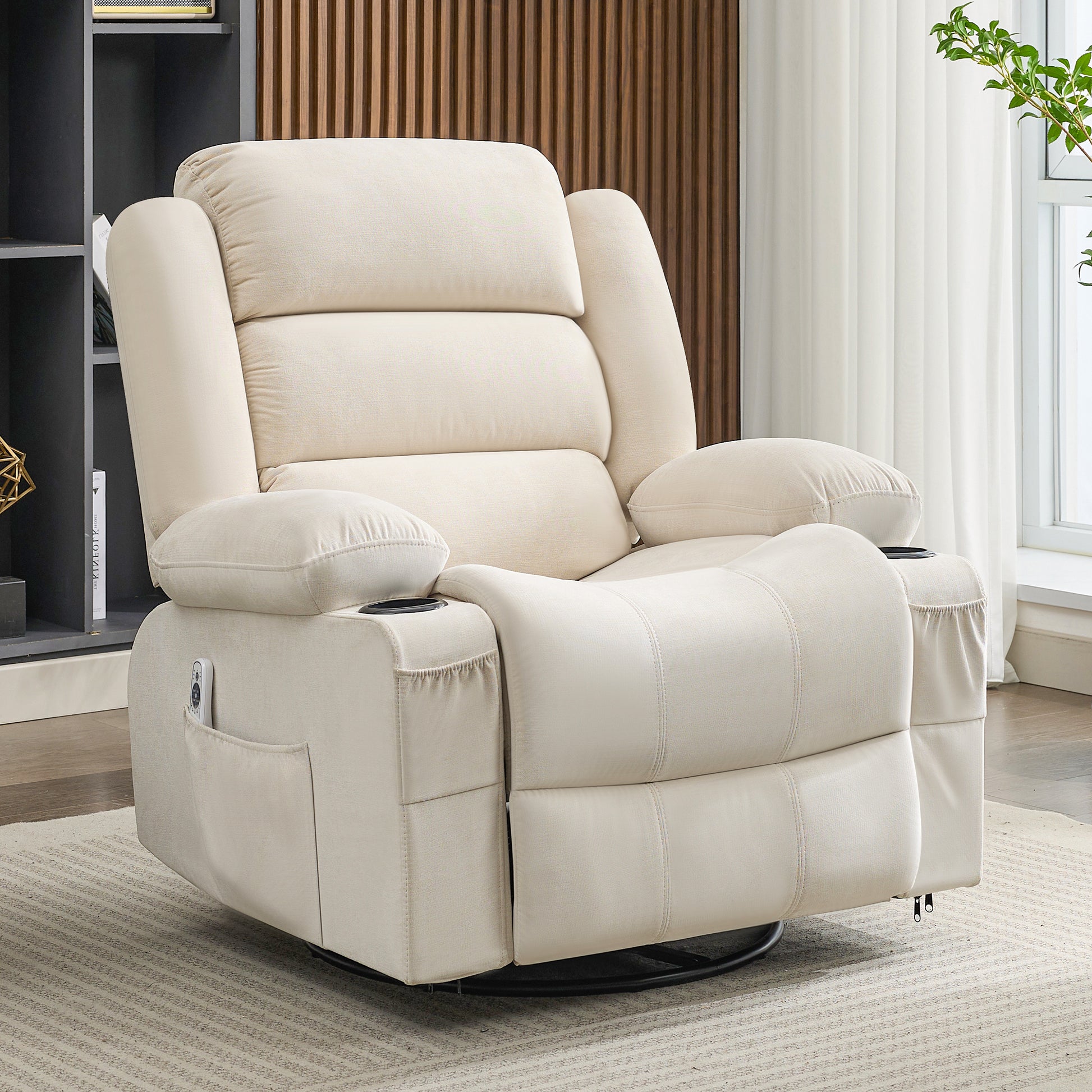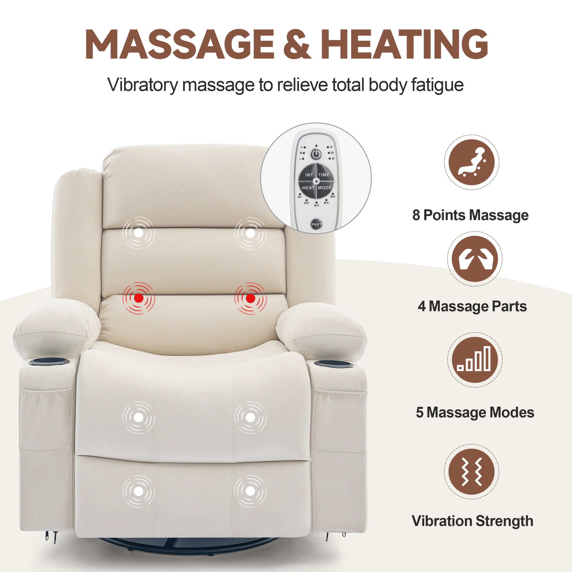 - Massage and Heating: Enjoy ultimate relaxation with this massage recliner featuring 8 powerful massage points targeting your back, lumbar, thighs, and legs. Choose from five massage modes and three intensity levels, plus a heating function for the lumbar area. Set a timer for 15, 30, or 60 minutes